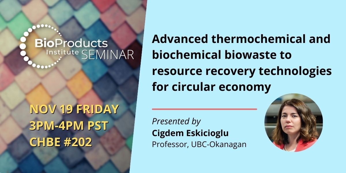 Join us to learn about the potential of converting municipal and industrial biowaste to high value bioproducts! Prof. Cigdem Eskicioglu, Leader of the UBC Bioreactor Technology Group at UBC Okanagan, will highlight her innovative research on biomass conversion, and recovery and utilization.