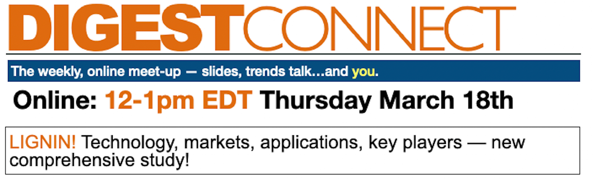 DigestConnect is weekly, online, up-to-the-minute and free. 12-1pm EDT Thursdays, join a live, online discussion forum for technologists, project developers, industry suppliers, growers, policymakers, distributors, financiers and more.